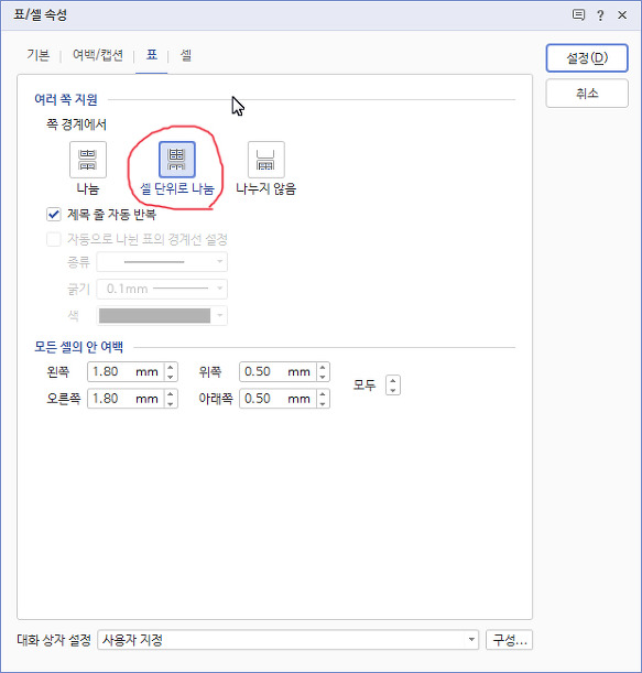 셀 단위로 나눔을 선택하면 쪽 경계에서 셀 단위로 끊어지기 때문에 하나의 셀이 다음 쪽으로 나눠지지 않습니다.